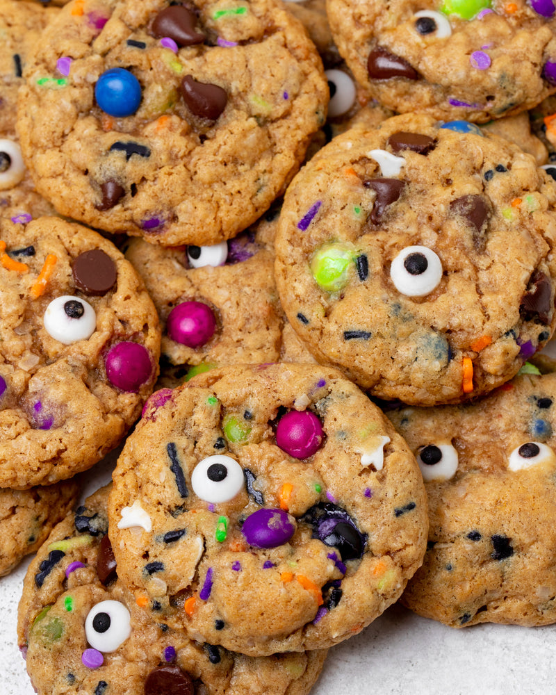Who said Halloween treats had to be labor intensive? These Spooky Monster Cookies are the easiest hack to our monster cookie mix. Just add in your favorite halloween sprinkles and voila!