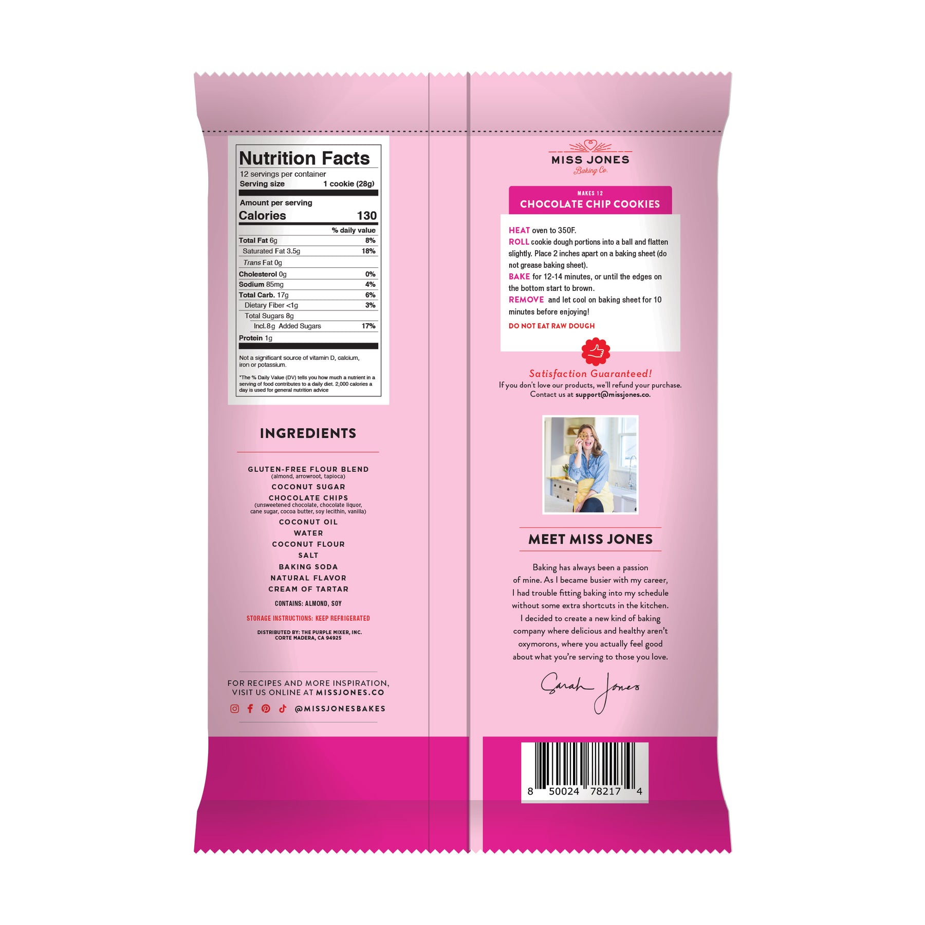 Ingredients: Grain-Free Flour Blend (almond, tapioca, arrowroot), Coconut Sugar, Chocolate Chips (unsweetened chocolate, chocolate liquor, cane sugar, cocoa butter, soy lecithin, vanilla), Coconut Oil, Water, Coconut Flour, Vanilla Flavor, Salt, Baking Soda, Cream of Tartar,.